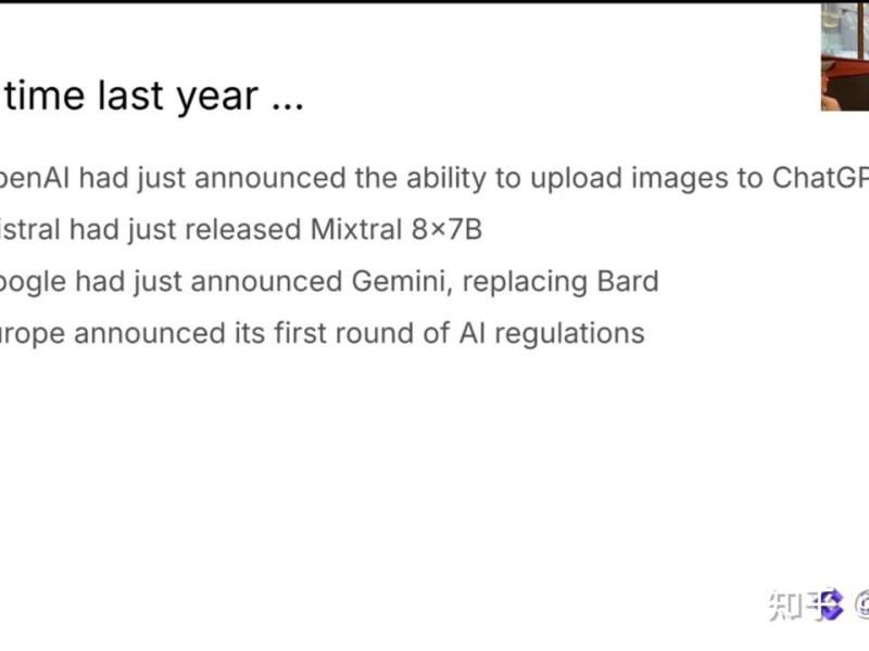 我们回到去年的这个时候,2023年10月,OpenAI刚支持了图像模态,Mistral发布了Mixtral 8*7B模型,Google发布了Gemini来替代Bard,欧洲宣布了第一轮AI监管法规。