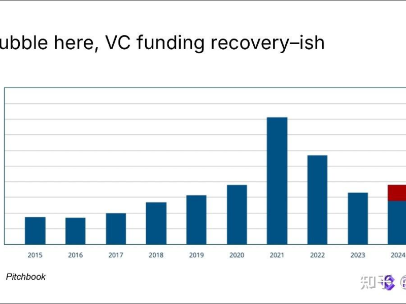 我们提取了一些PitchBook的数据,2024年的可能不完整。看起来资金面出现了大幅复苏,似乎2025年将会与2021年相似,但是仔细观察会发现,红色的部分来自于基础大模型,募集了高达300-400亿美元。