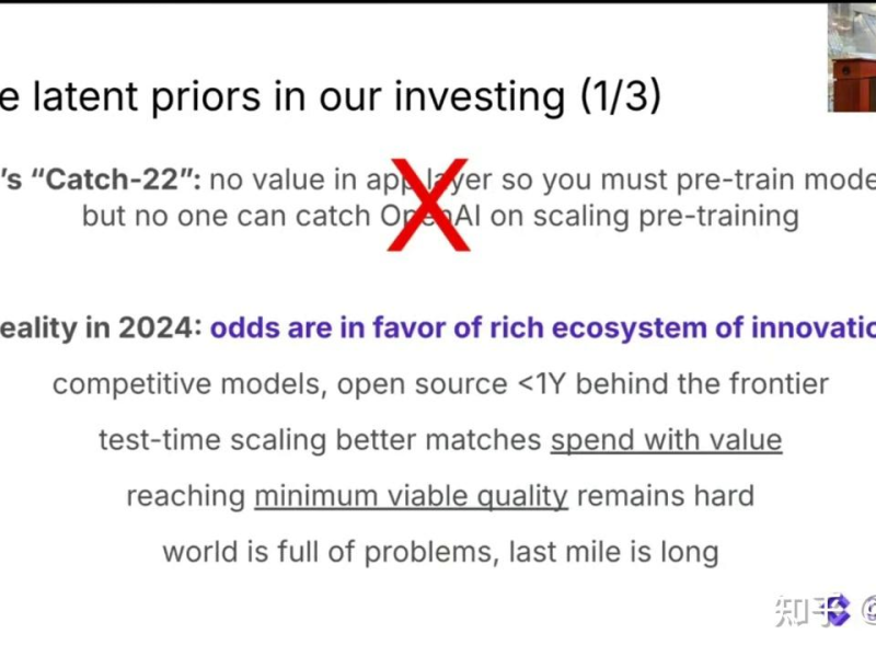 当时,公司和投资者之间流行着一种说法,引发了关于生态系统中价值所在以及初创企业是否有机会的激烈讨论。如果你还记得,“GPT包装器”这一说法曾一度主导了科技生态系统,它代表着一种观点,即应用层没有价值。人们认为必须专注于预训练,而在这个领域没有人能赶上OpenAI。这并不是对OpenAI的批评,因为它们在推动生态系统发展方面做出了令人难以置信的工作。