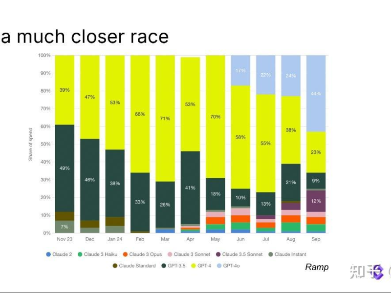 首先,基础模型领域的竞争比2023年更加激烈。LLM Arena的用户评估显示,OpenAI模型已经从领先100分以上变成了略微落后于Google Gemini。这表明大语言模型的切换非常容易,人们正在尝试不同的选择来找到最适合自己的模型。2023年11月,OpenAI占据了90%的市场份额,目前已降至60%左右。