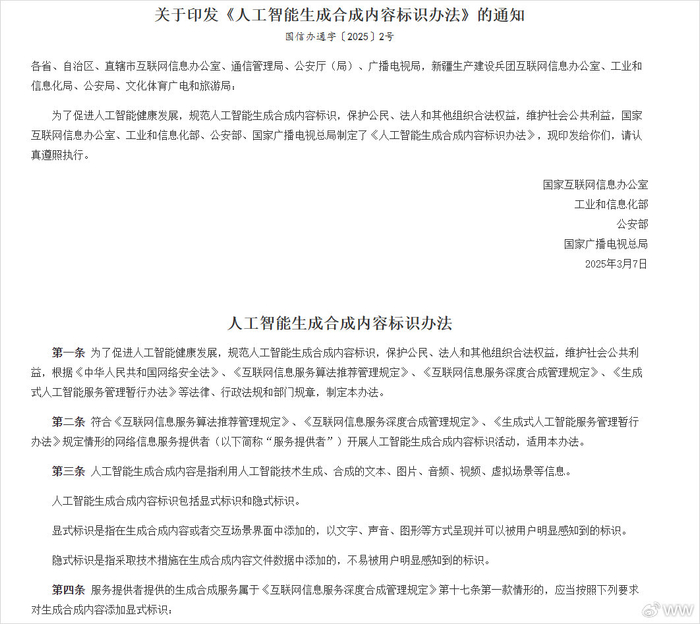 今天,是9月1号。可能很多朋友还不知道,今天,有个跟整个行业都相关的法规,开始正式实行了。这个的影响,非常的深远,说会改变整个互联网上AI内容的生态都不为过。那就是今年3月印发的《人工智能生成合成内容标识办法》,还有为了配套《标识办法》,强制性国家标准《网络安全技术 人工智能生成合成内容标识方法》,都从9月1号,也就是今天,开始正式执行。