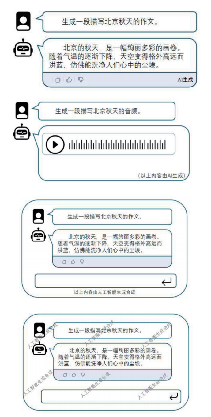 最后,在所有的AI模型或AI应用的交互界面上,也都要进行标识,可以在内容附近持续显示提示文字,或者在交互场景界面顶部、底部、背景等适当位置持续显示提示文字。