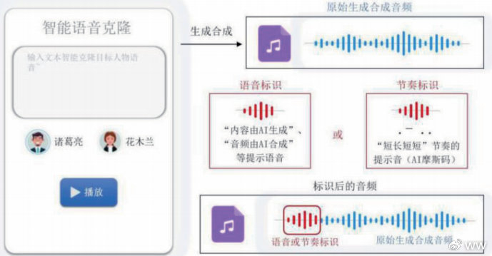 这个最有意思。生成出来的音频内容,要么是在音频开头或结尾,用语音直接说一句“由AI生成”,同时,语音标识应使用正常语速,大概就是120 字/min~160 字/min那种速度之间。