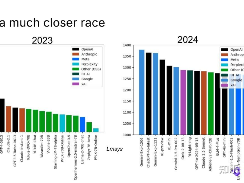 首先,基础模型领域的竞争比2023年更加激烈。LLM Arena的用户评估显示,OpenAI模型已经从领先100分以上变成了略微落后于Google Gemini。这表明大语言模型的切换非常容易,人们正在尝试不同的选择来找到最适合自己的模型。2023年11月,OpenAI占据了90%的市场份额,目前已降至60%左右。
