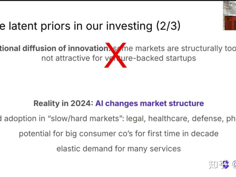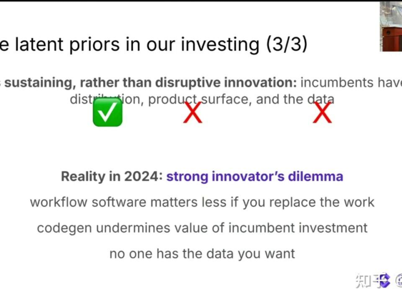 第二个话题是价值是流向初创企业还是现有公司。风险投资的原则是投资资本效率高的、增速快,最终价值将会是百亿美元的企业。像法律、医疗保健、国防等领域,VC会认为不是好的市场,没人能在那里赚钱,很难销售,没有预算等等。然而,如果你看看过去一年真正有效率的一些公司,恰恰在这些传统上非显而易见的市场中运营。这让我得出一个更为乐观的观点:AI确实很有用,如果你创造了一种比现有能力便宜几个数量级的新能力,就可以改变购买模式和市场结构。例如,法律行业可能已经很长时间没有购买任何东西了,因为没有值得购买的产品。