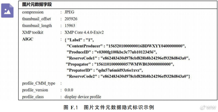 基本上,未来的所有AI模型或AI应用生成出来的任何模态的内容,都需要进行标识,用户在使用AI模型或AI应用生成出来的,也都会带有标识。且根据《标识办法》第十条,任何组织和个人不得恶意删除、篡改、伪造、隐匿本办法规定的生成合成内容标识,不得为他人实施上述恶意行为提供工具或者服务,不得通过不正当标识手段损害他人合法权益。否则,视为违法。不过有一种情况可以例外。就是根据《标识办法》第九条,用户申请服务提供者提供没有添加显式标识的生成合成内容的,服务提供者可以在通过用户协议明确用户的标识义务和使用责任后,提供不含显式标识的生成合成内容,并依法留存提供对象信息等相关日志不少于六个月。这一条,它其实是给专业生产流程留的一条合规绿色通道。有时候作为专业人员,你确实需要一份干净素材去做二次创作,比如影视后期、广告合成、出版排版、研究评测等等。如果一上来就把显式大标签烙在画面上,那后续流程全乱了,根本没法做。所以第九条允许服务提供者(即AI模型和AI应用提供方)在和特定用户签清楚使用责任和标识义务之后,可以提供不带显式标识的素材,但同时把对方的信息和相关日志留存不少于六个月,留痕可追责。这一点,有些AI应用平台和他们的超级创作者已经在开始试水了。但是还是要注意几个关键点。第一,只是放开显式,不是放开隐式,元数据和数字水印该有一样不能少,否则就违反第五条和标准。第二,这份不带显式标识的内容,一旦进入公开传播,你作为内容发布者还是得在发布平台例如公众号、小红书等等上主动声明并标注,平台那边也会按第六条再标识一次,这是闭环。第三,你自己删标识永远是禁区,谁删谁担责。用一句话总结就是,对专业环节友好,对公开传播严厉。二. 隐形标识显性标识是给人看的,隐形标识其实就是给机器和监管看的。它像给内容塞了一张身份证外加指纹,藏在文件头的元数据里,不挡你的观看体验,但一旦出了事,就能顺着这串信息就能把来龙去脉复原,找到源头。办法写得很明白,服务提供者要在生成合成内容的文件元数据里加隐形标识,至少包含三个信息:这是不是AIGC、是谁生成的、这条内容的唯一编号。同时鼓励再叠一层数字水印,提升溯源的韧性。做法是往文件元数据里新增一个包含AIGC关键词的扩展字段,里面放一个小字典。Label表示属性,支持三种状态:1是确定,2是可能,3是疑似;ContentProducer和 ProducerID记录生成方及其内部编号,等到内容进入平台流转,平台要把自己这边的ContentPropagator和PropagateID写回去,链路就算闭环了。然后还预留了ReservedCode1和ReservedCode2给安全加固用,比如做数字签名,防止被人半路改头换面。属于人工智能生成合成的图片文件元数据隐式标识示例: