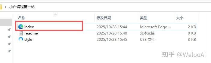 创建核心文件:在VS Code左侧的"资源管理器"中,右键点击"小白编程第一站"文件夹,选择"新建文件"。依次创建3个文件:index.html(用于存放页面的文字、图片等内容,是页面的"骨架");style.css(用于美化页面,比如设置颜色、字体大小等,是页面的"妆容");readme.txt(用于记录学习过程中的笔记,比如遇到的问题和解决方法)