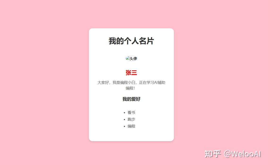 可以看到页面虽然比较简陋,但确实也就2分钟设计出来的,作为纯小白编程的第一个成品,已经不错了。而且如果你不满意,还可以直接让AI进行修改(比如换背景色、改头像),不用自己学语法,直接问AI即可。例如:想把背景色改成粉色,向AI提问:如何修改style.css文件,让页面背景色变成粉色?它会直接帮你修改源文件。