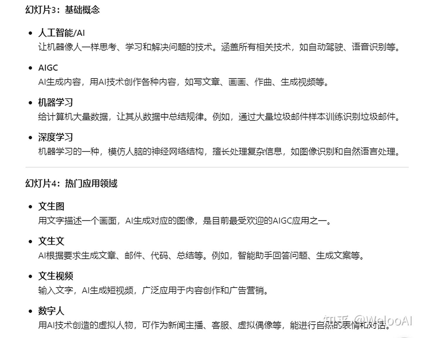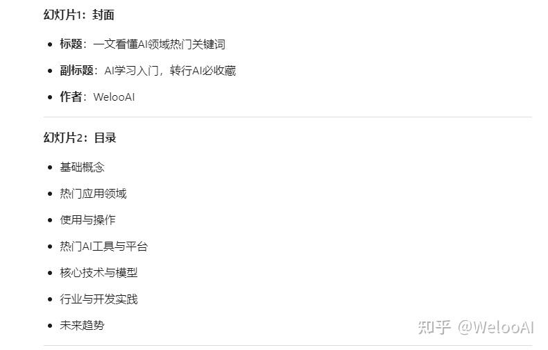 这样我们得到了1份PPT文案,可以看到不只是对文章的内容作出了概括总结,还生成了PPT的封面和目录文案,我们对文案进行核对,发现其和文章内容十分契合,理解与生成的内容是十分准确的,这里点个赞👍: