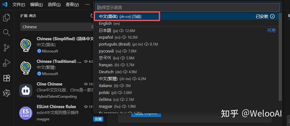 打开VS Code,在左侧扩展应用商店(4个小方块),搜索Chinese(这个是软件的中文插件,然后进行安装),同时这里也搜索通义灵码把我们待会儿会用的AI插件也安装上。