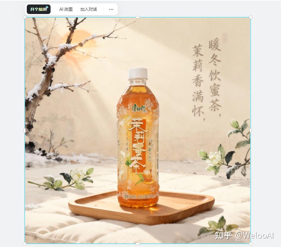 以产品图为基础,生成节气宣传海报,海报内容如下:新中式水墨意境,立冬薄霜覆枯枝,斜射暖阳穿疏枝洒地面,透明玻璃瓶装茉莉蜜茶置于浅木托盘上,琥珀色茶汤漂浮洁白茉莉花瓣,杯壁凝细微水珠,背景点缀几枝带霜绿茉莉,地面铺浅米白软垫,整体暖调柔和,光影通透,细节细腻,8K 高清,极简雅致,文案:暖冬饮蜜茶,茉莉香满怀