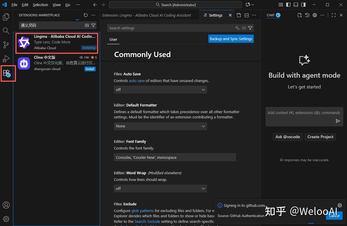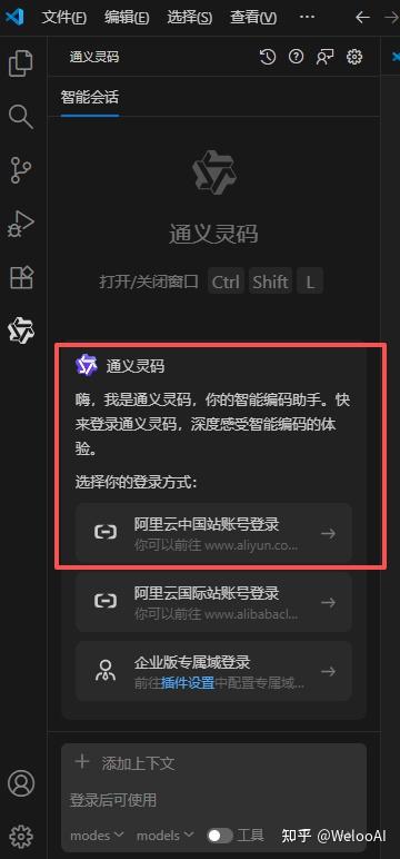 2.登录通义灵码。刚才搜索的通义灵码(Lingma)等待10秒左右安装完成,重启VS Code使插件生效。重启后,插件会提示"登录阿里云账号",点击后用手机阿里云APP扫码登录(没有账号的话,用手机号注册即可,免费使用基础功能),登录成功后插件自动激活。