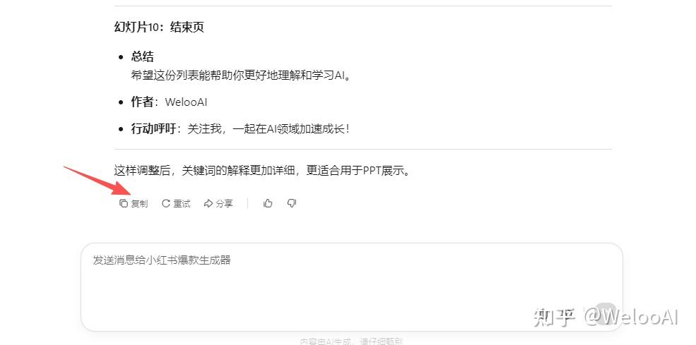 4.接下来,我们利用Kimi的PPT工具来制作PPT,点击复制前面生成的PPT文案(一定要用AI工具这个复制按钮,不要自己选中复制,这样能将格式正确复制下来)。