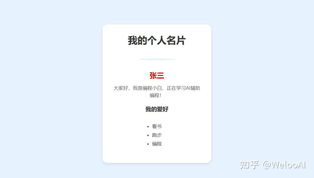需求指令:帮我写一个简单的个人信息展示页面,用HTML和CSS实现,具体要求如下:1. HTML文件命名为index.html,CSS文件命名为style.css,两个文件要关联起来;2. 页面内容包括:顶部标题"我的个人名片"、圆形头像(用网络图片链接,比如https://example.com/avatar.jpg,可自行替换)、姓名(比如"张三")、个人简介(比如"大家好,我是编程小白,正在学习AI辅助编程!")、爱好列表(比如"看书、跑步、编程");3. 样式要求:页面背景为浅蓝色,个人信息放在白色卡片中,卡片居中显示,有圆角和阴影,文字居中对齐,姓名用红色粗体,爱好列表用圆点样式;4. 给代码加上详细注释,解释关键部分的作用,方便小白理解。