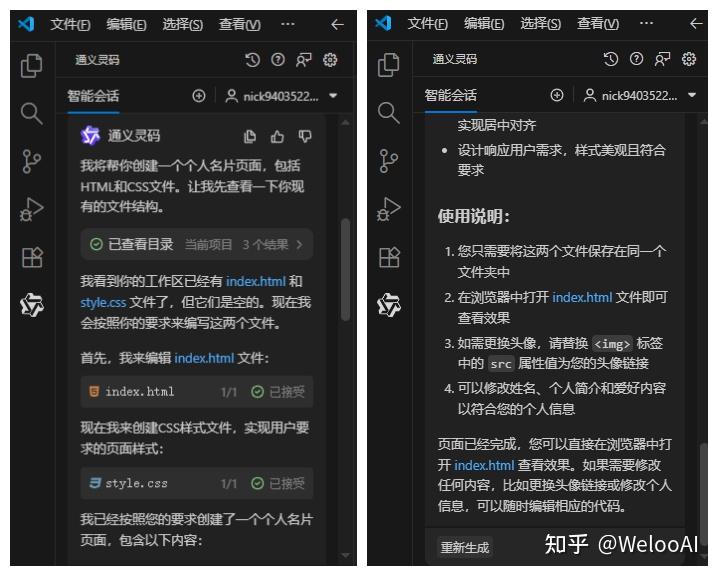 可以看到灵码已经编辑好了两个文件,点击“接受”,就会现实已接收。这表示它已经为这个页面写好了代码。同时右图里还贴心地给你贴上了使用方法和提示,以及内容修改操作等等。